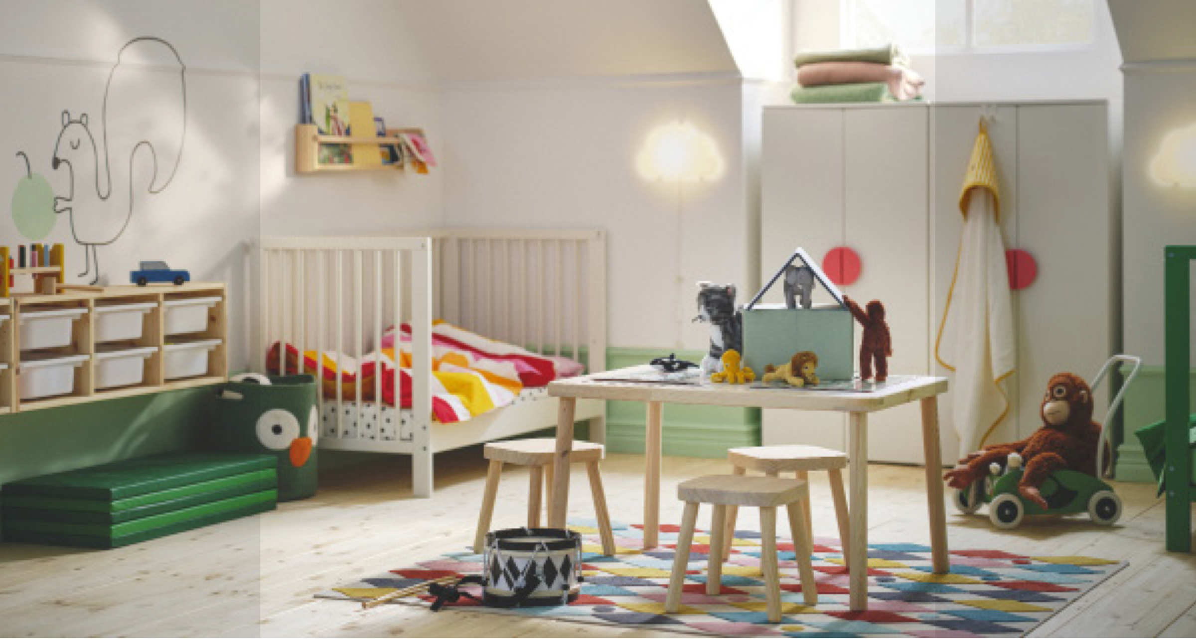 What and why: Creating a shared bedroom that caters to all the needs of small children can be difficult. This colourful, fun space was created to show different ways to support play, better sleep routines, and manage storage needs of two children in a calm, uncluttered way.