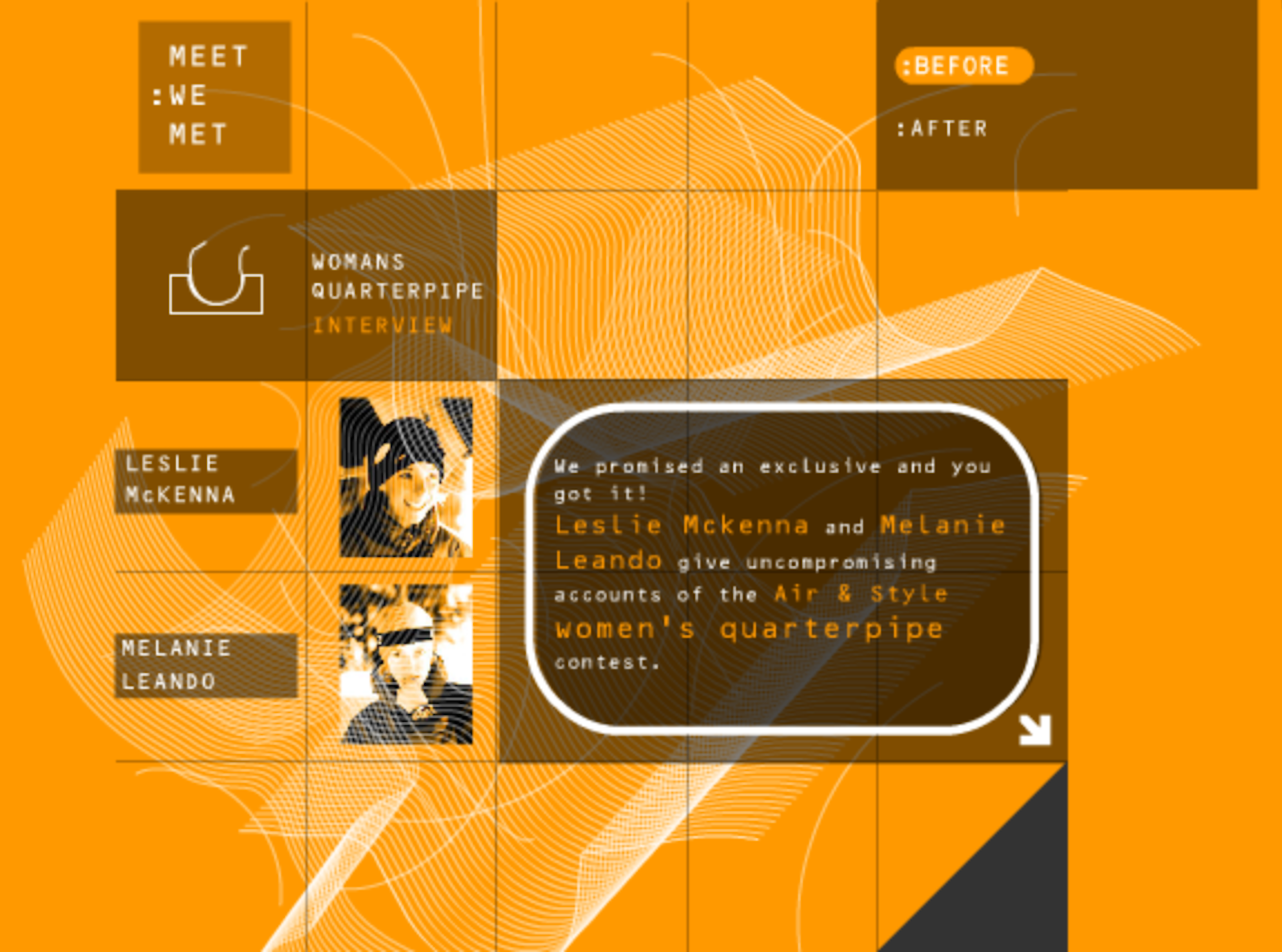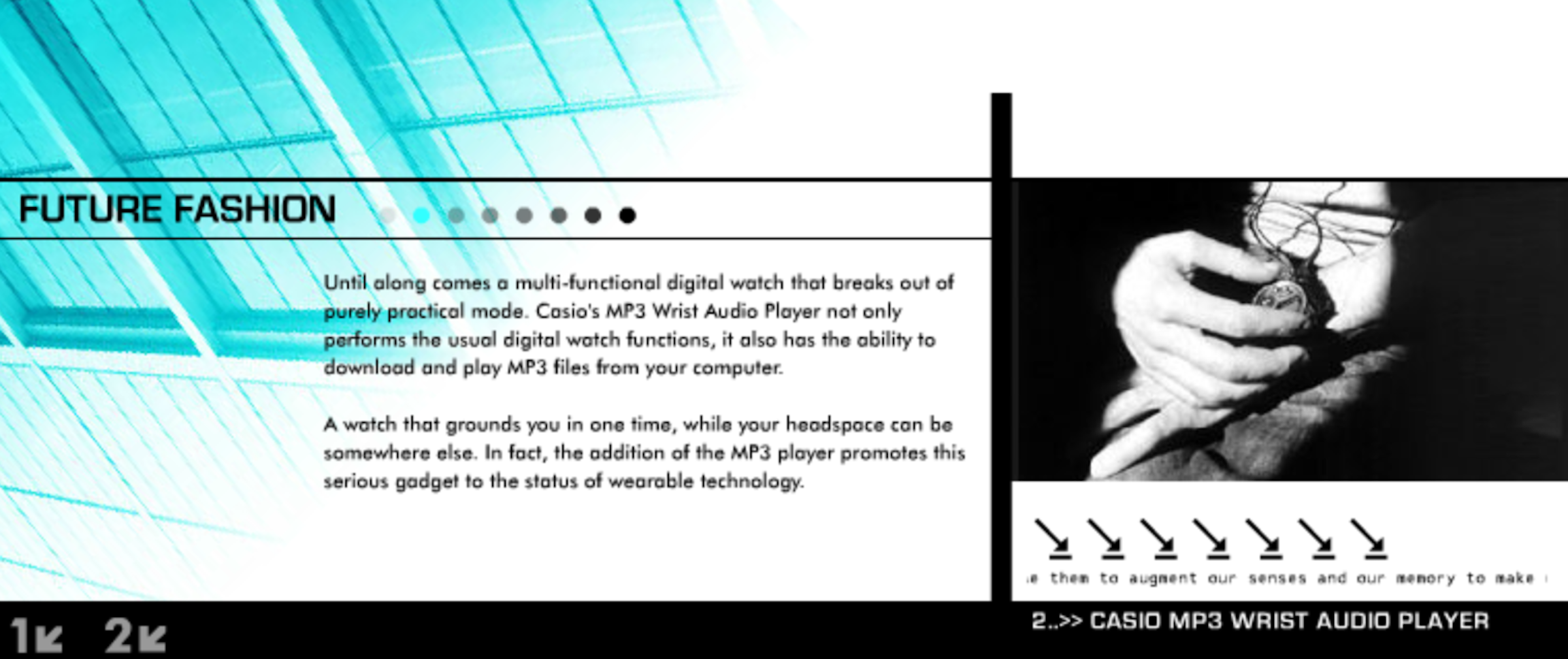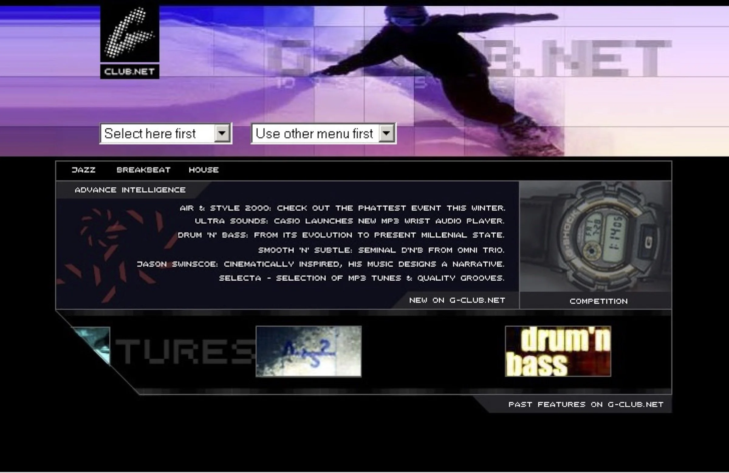 Screens from an article about wearable technology to celebrate launch of the Casio G-Shock watch with MP3 player; interviews with snowboarders, and home pages.