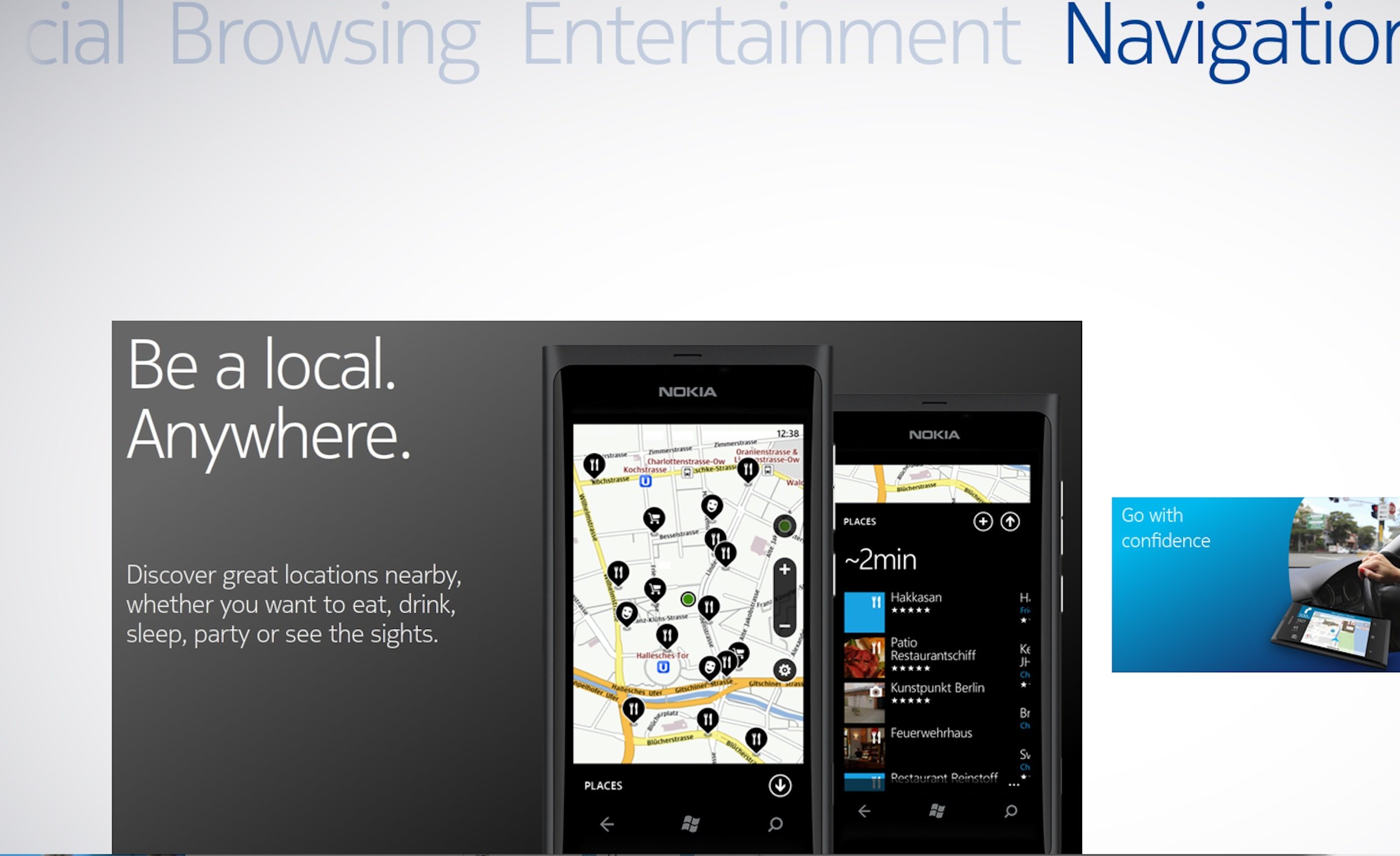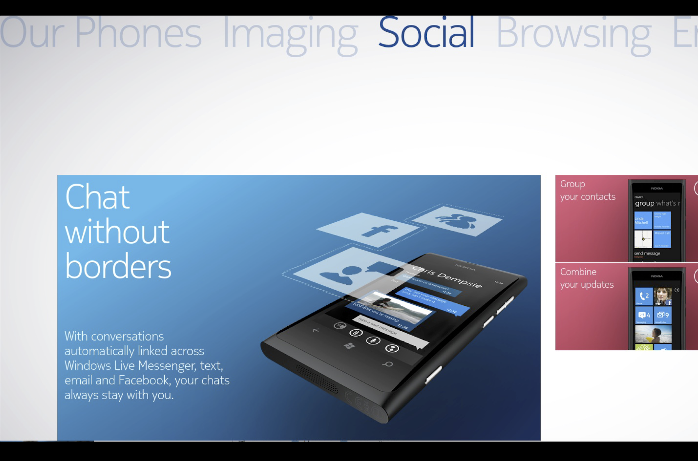 What and why: The Devices and Gear touchscreen let customers filter and browse phones and accessories by feature. Customers could choose to browse and filter by feature, or learn more about the benefits of Nokia phones by exploring different categories of features such as entertainment or navigation.