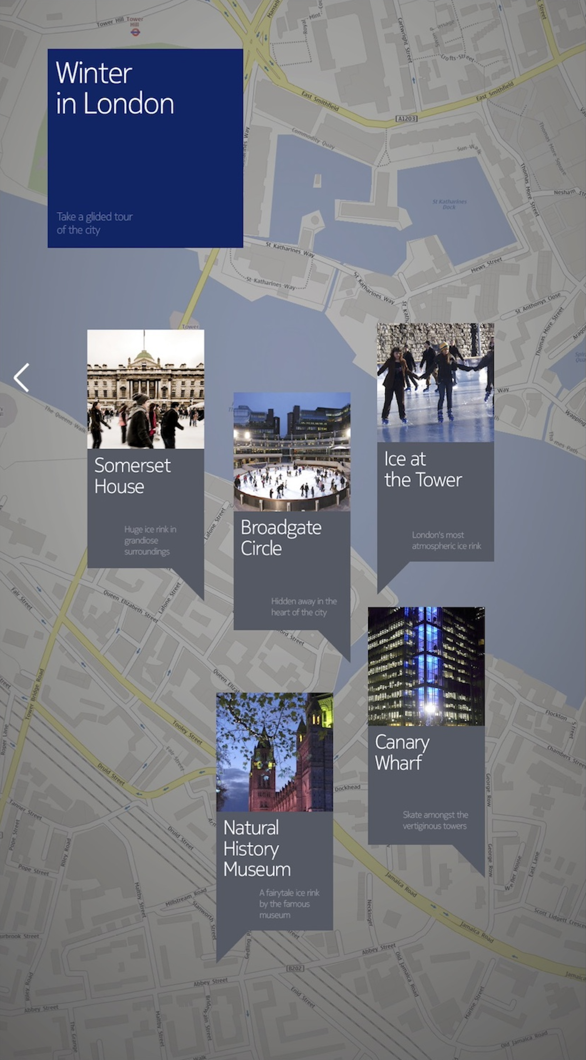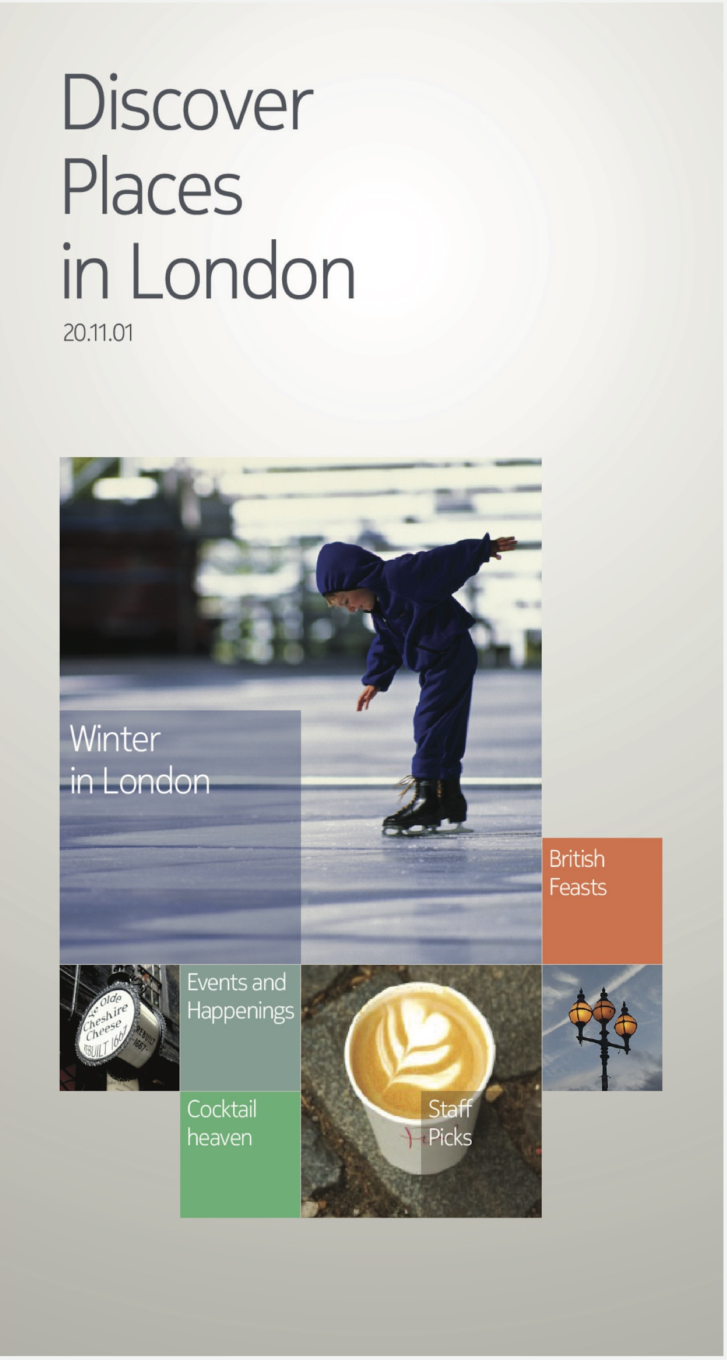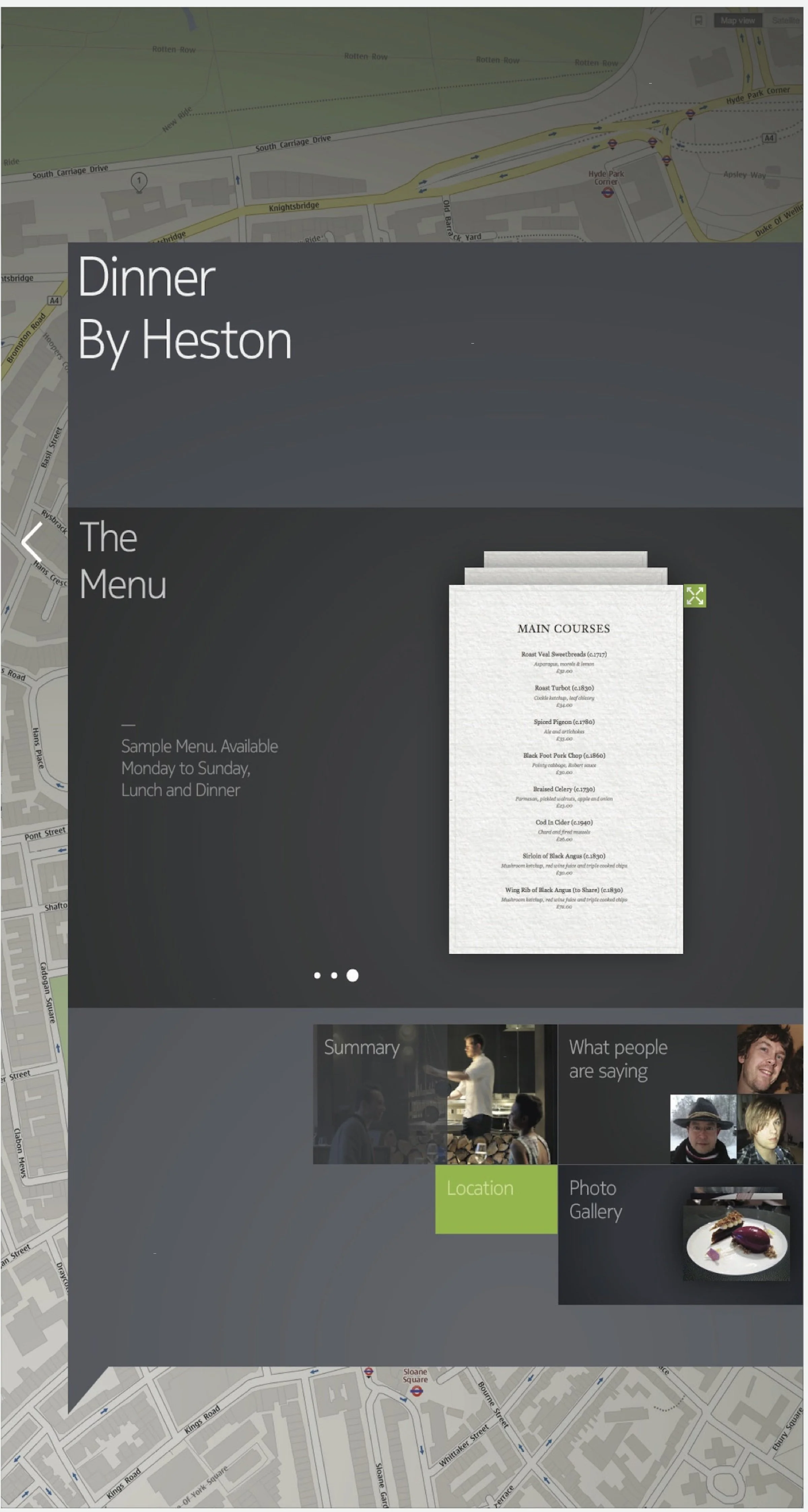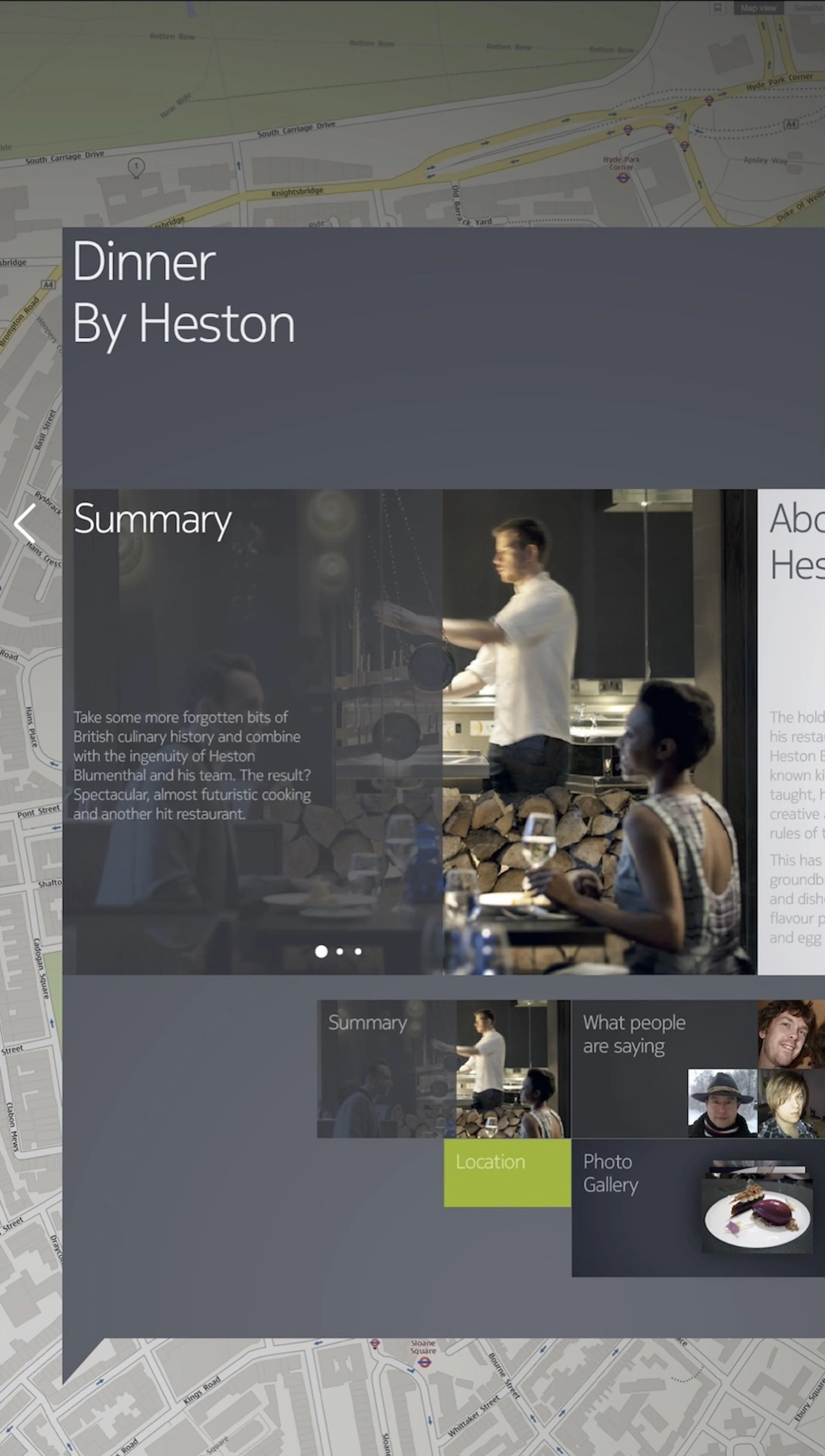 The following slides show some of content developed for the London pilot and what happened when users clicked on the tiles. The theme was ‘winter in London’ and the hero feature focused on outdoor ice rinks around the city. Categories were also developed around London eateries, using Dinner by Heston Blumenthal as an example.